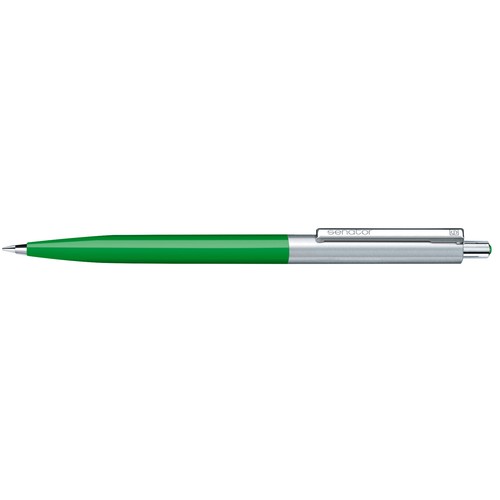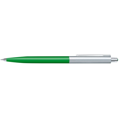 Stylo à bille rétractable.Surface du corps opaque brillante,partie supérieure en métal, attributsen métal, poussoir avec décor en matière plastique colorée,