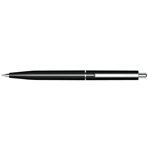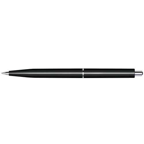 Stylo à bille rétractable.Surface du corps opaque brillante,attributs en métal, poussoir avec décor en matière plastique colorée