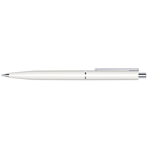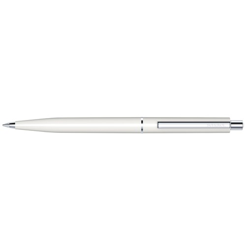 Stylo à bille rétractable.Surface du corps opaque brillante,attributs en métal, poussoir avec décor en matière plastique colorée