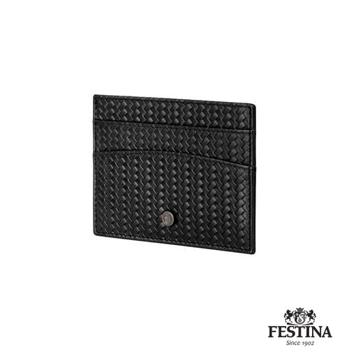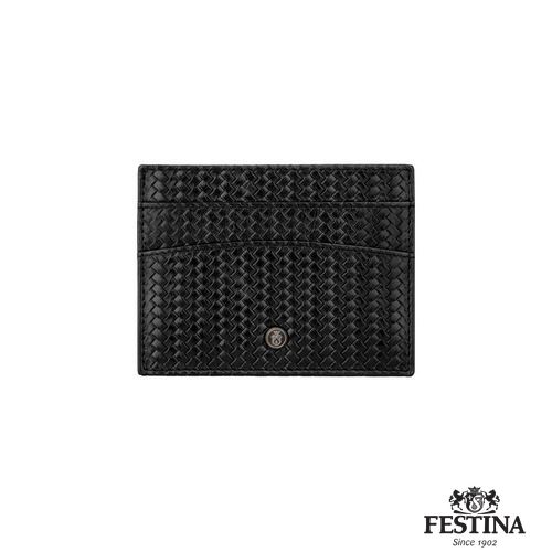The Interlace card holder is crafted from selected leather and enhanced with an imprinted braided woven pattern that lends a luxe, effortlessly chic appeal. Its clean, minimal silhouette is refined by a single button engraved with the brand’s blazon, echoing the signature pattern also found on selected pens for an elegant pairing in polished gift sets. Compact yet designed for optimal organization, it offers two front slots, two back slots, and a main top compartment, with a smooth leather panel at the back featuring a luxurious yet understated embossed Festina logo.