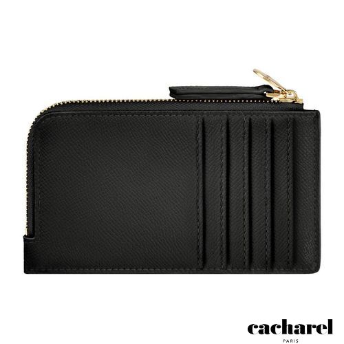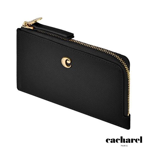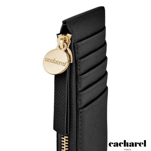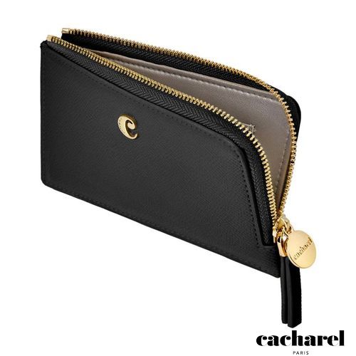 The Seraphine card holder combines practicality with a touch of playful elegance. This long zipped design is crafted from beautiful saffiano- textured vegan leather with a luxurious matte finish. It is signed with a gold- toned C plate on the front and completed by a refined metal plate on the zipper puller. Its spacious main compartment allows for easy organization, complemented by one inner card slot and five additional card slots on the back. A functional yet stylish everyday essential. This black version features a contrastive Taupe lining adding a touch of playfulness to this accessory.