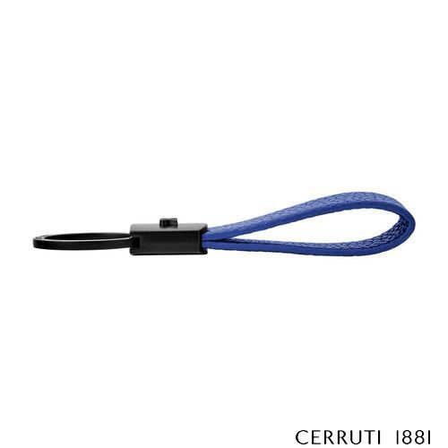 The Jefferson keyring in bright blue stands out as a vibrant, forward- looking interpretation of functional minimalism. Its bold grained texture meets matte black accents in a striking contrast that enhances the architectural definition of the CERRUTI 1881 3D RR logo, resulting in a statement accessory with a distinctly modern edge.