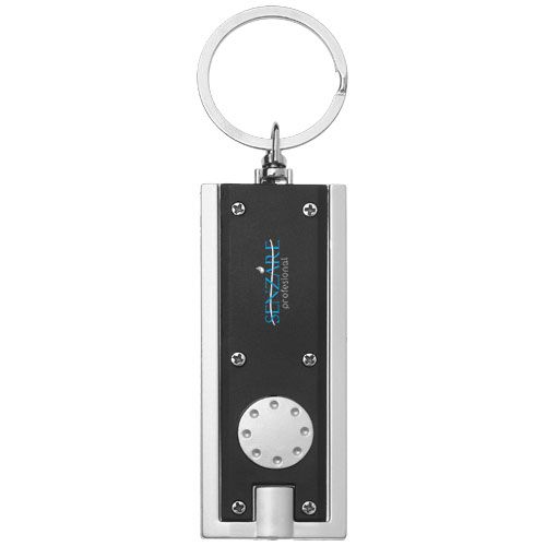 Porte clé torche à LED blanche lumineuse avec bouton- poussoir. Anneau métallique. Piles fournies.