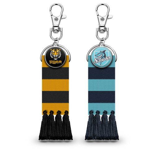 Élégant porte- clés composé d’une pièce en zamac finition nickel brillant, accompagnée d’une écharpe bicolore en fibres acryliques.