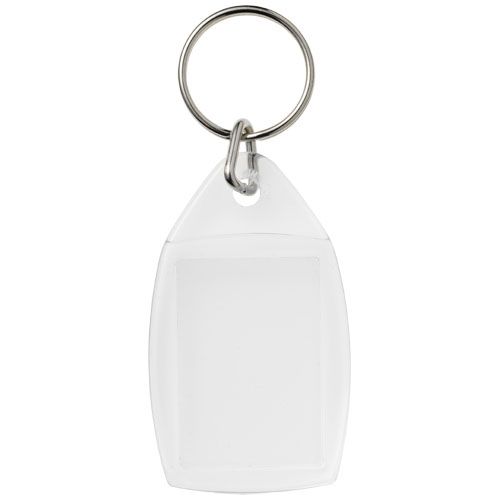 Porte- clés transparent P5 avec anneau fendu en métal. Dimensions de l’insert pour impression : 3,5 cm x 2,4 cm.