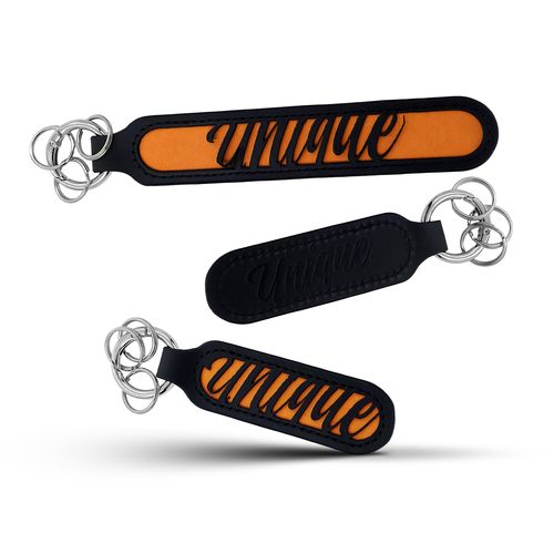 Porte- clés en PU au design élégant, personnalisable avec un logo en découpe et l’insertion d’un papier coloré pour un rendu visuel unique et impactant.