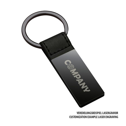 Ce porte- clés en similicuir noir présente un placage gunmetal noir brillant sur sa partie métallique personnalisable. Pour personnaliser votre porte- clés et en faire une véritable merveille, vous pouvez choisir une élégante gravure laser de qualité.