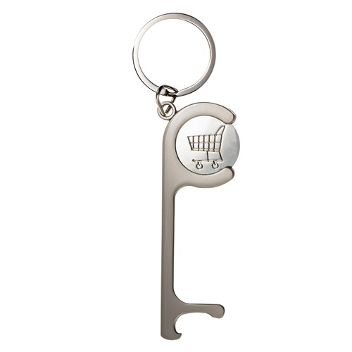 Avec le porte- clés MY- CADDY- DISTANCE, toucher des surfaces fréquemment utilisés devient évitable. Que ce soit les ascenseurs, digicodes ou les poignées de porte – l’utilisation du porte- clés hygiénique vous permet qu’aucune de ces surfaces soit touchée avec les mains. De même, le MY- CADDY- DISTANCE à un ouvre- bouteille et un jeton caddie. Tant de fonctions pratiques qui sont combinées sur ce porte- clés.