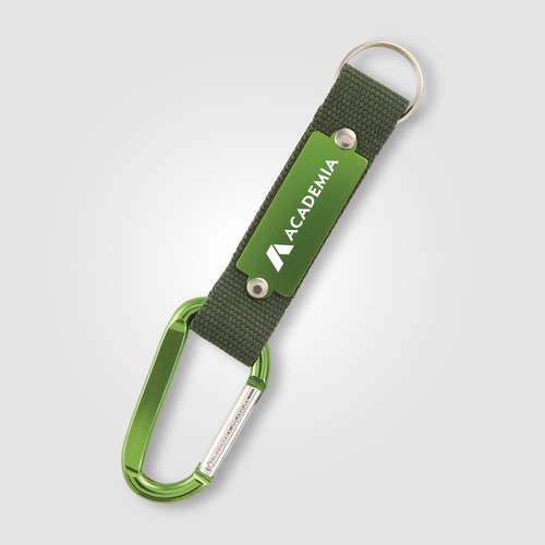 Mousqueton publicitaire avec sangle en maille et plaque en métal gravée au laser. Sept couleurs au choix.
