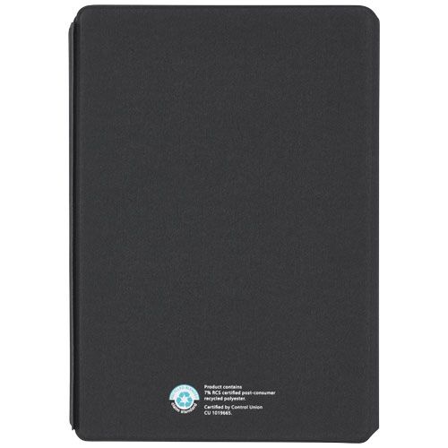 Le porte- documents Notu certifié RCS est partiellement fabriqué à partir de polyester recyclé post- consommation, ce qui en fait un choix plus durable, puisqu'il contribue à réduire l'utilisation de matières premières vierges. Il est doté d'une fermeture aimantée, d'une pochette accordéon et de 64 feuilles lignées de couleur crème avec du papier recyclé de 80 g/m2 provenant de sources durables.