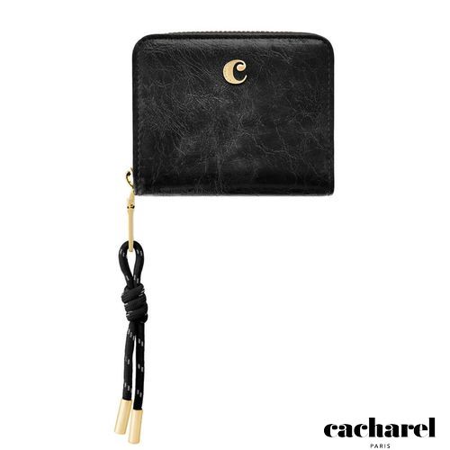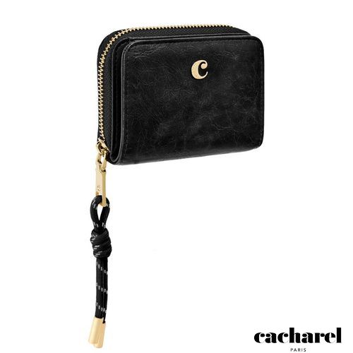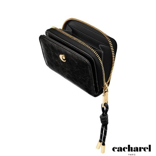 The Philomene flap wallet stands out with its modern, fashion- forward attitude. Crafted from a glazed, crinkled leather- like texture, it combines bold character with refined detailing. The design is signed with the signature Cacharel C plate and elevated by elegant gold trims. A distinctive utility- inspired cord element on the zipper puller adds a contemporary contrast to the wallet’s sophisticated finish. Inside, two main compartments offer smart organization: a zipped section with four card slots and a coin pocket, and a flap section featuring a note compartment and six additional card slots. Available in a chic palette of black, camel, and burgundy.