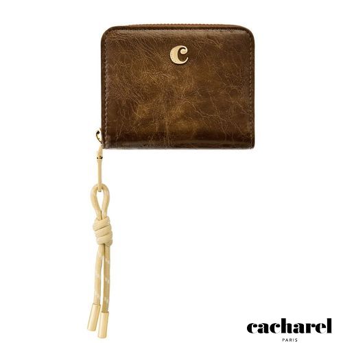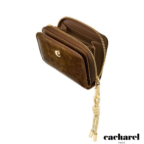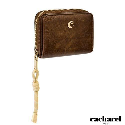 The Philomene flap wallet stands out with its modern, fashion- forward attitude. Crafted from a glazed, crinkled leather- like texture, it combines bold character with refined detailing. The design is signed with the signature Cacharel C plate and elevated by elegant gold trims. A distinctive utility- inspired cord element on the zipper puller adds a contemporary contrast to the wallet’s sophisticated finish. Inside, two main compartments offer smart organization: a zipped section with four card slots and a coin pocket, and a flap section featuring a note compartment and six additional card slots. Available in a chic palette of black, camel, and burgundy.
