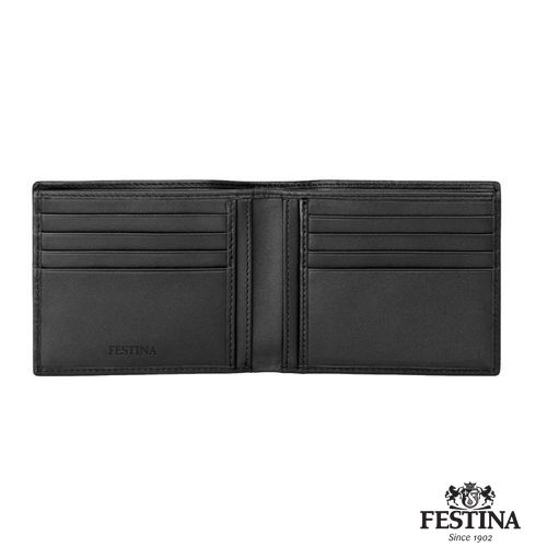 The Interlace classical card wallet is crafted from selected leather and distinguished by an imprinted braided woven pattern that delivers a luxe, effortlessly chic aesthetic. Its clean, minimal silhouette is subtly elevated by a single button engraved with the brand’s blazon, echoing the same refined pattern found on selected pens for an elegant gift- set pairing. Inside, a luxurious yet understated embossed Festina logo enhances its sophisticated appeal, while thoughtful organization includes a banknote compartment divided in two, four regular card slots on each side, and two larger vertical sliding compartments for added practicality.