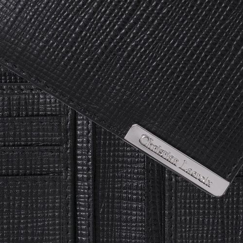 Le portefeuille porte- cartes noir "More" de Christian Lacroix est réalisé dans un cuir véritable noir texturé et orné d'une élégante signature en métal chromé brillant. Il comporte 6 emplacements pour cartes de crédit, et 2 compartiments pour les billets. Poids : 69 g - Dimension : 119 x 19 x 97 mm. Livrée dans son élégant coffret noir Christian Lacroix.