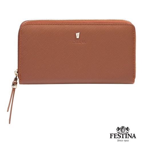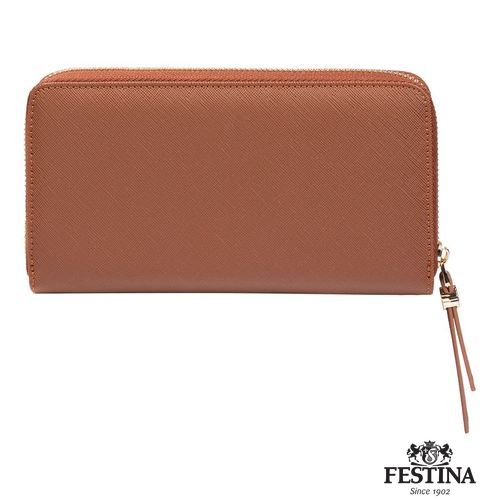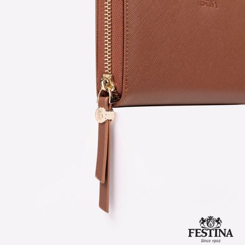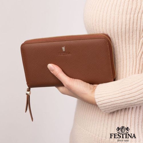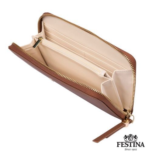 Le portefeuille pour femme "Mademoiselle" est réalisé en cuir végétalien (PU) saffiano magnifiquement texturé. Chaque détail est délicatement travaillé, comme les tirettes de la fermeture éclair, ornées du blason Festina et inspirées des boutons d'arrêt de la montre emblématique de la marque. Magnifiquement conçu, le produit présente des intérieurs colorés, contrastés et très pratiques. Cette version Camel présente un intérieur contrasté en blanc cassé. Chaque portefeuille est terminé par une signature Festina finement embossée, sous une version dorée de la luxueuse plaque "F".