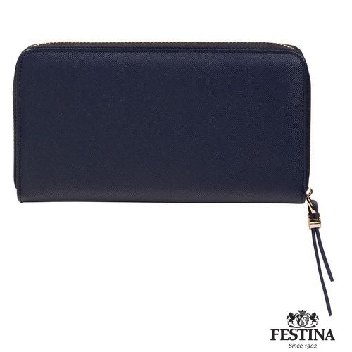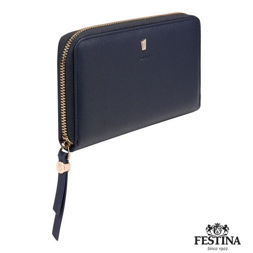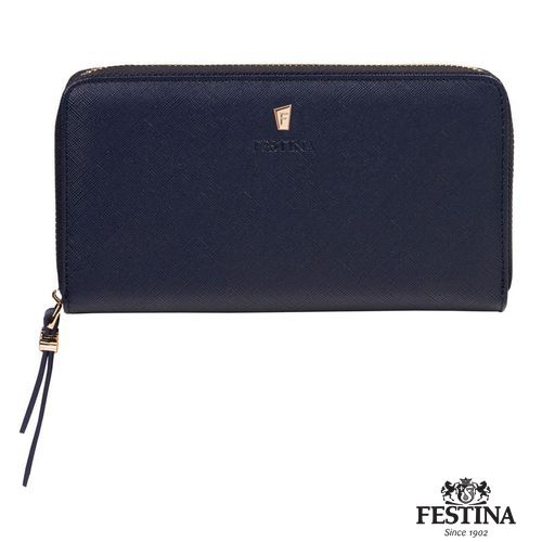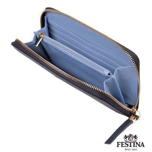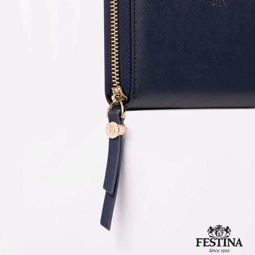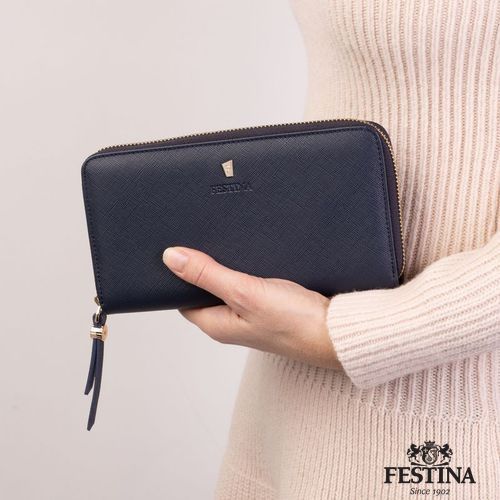 Le portefeuille pour femme "Mademoiselle" est réalisé en cuir végétalien (PU) saffiano magnifiquement texturé. Chaque détail est délicatement travaillé, comme les tirettes de la fermeture éclair, ornées du blason Festina et inspirées des boutons d'arrêt de la montre emblématique de la marque. Magnifiquement conçu, le produit présente des intérieurs colorés, contrastés et très pratiques. Cette version Navy présente un intérieur bleu clair contrasté. Chaque portefeuille est terminé par une signature Festina finement embossée, sous une version dorée de la luxueuse plaque "F".