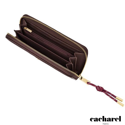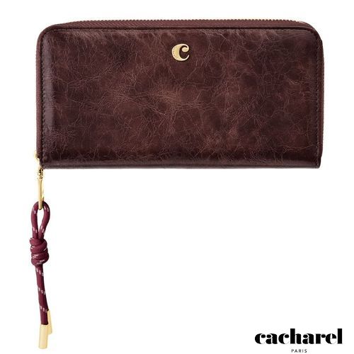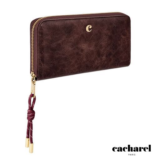 The Philomene zipped wallet combines elegance with a strong fashion- forward edge. Crafted from a glazed, crinkled leather- like texture, it is signed with the signature Cacharel C plate and highlighted by refined gold trims. Its distinctive zipper puller features a utility- inspired cord element that contrasts beautifully with the wallet’s chic and sophisticated finish. Inside its zipped interior, the wallet offers generous organization with a large zipped coin compartment, twelve card slots, and two note compartments, ensuring both style and practicality. Available in a chic palette of black, camel, and burgundy.