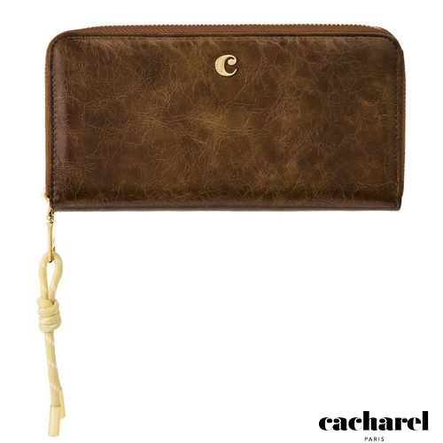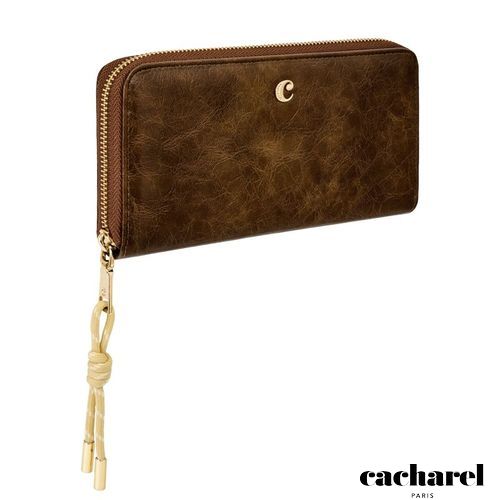 The Philomene zipped wallet combines elegance with a strong fashion- forward edge. Crafted from a glazed, crinkled leather- like texture, it is signed with the signature Cacharel C plate and highlighted by refined gold trims. Its distinctive zipper puller features a utility- inspired cord element that contrasts beautifully with the wallet’s chic and sophisticated finish. Inside its zipped interior, the wallet offers generous organization with a large zipped coin compartment, twelve card slots, and two note compartments, ensuring both style and practicality. Available in a chic palette of black, camel, and burgundy.