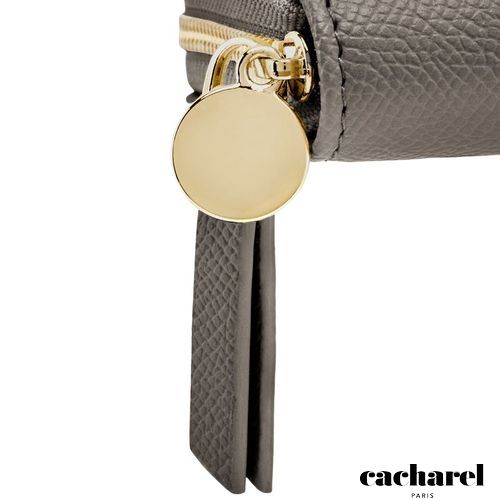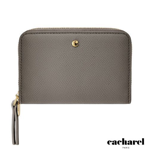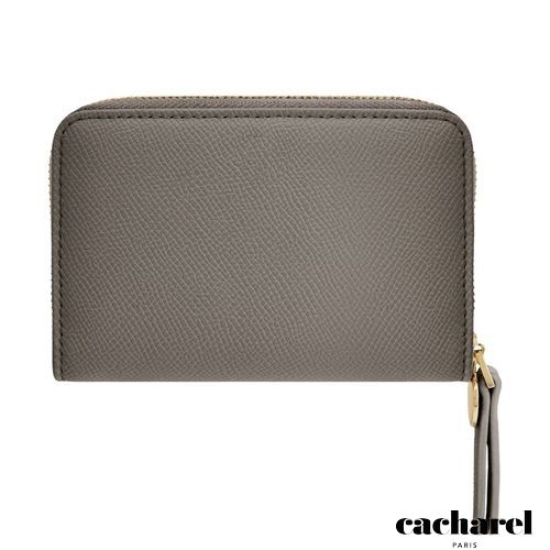 The Seraphine compact wallet blends practicality with refined style. Made from saffiano- textured vegan leather in a luxurious matte finish, it features a gold- toned C plate on the front and a matching metal plate on the zipper puller. Its compact format opens to a well- organized interior with four card slots and a zipped compartment, making it both functional and elegant for everyday use. Available in taupe, black, and light grey.