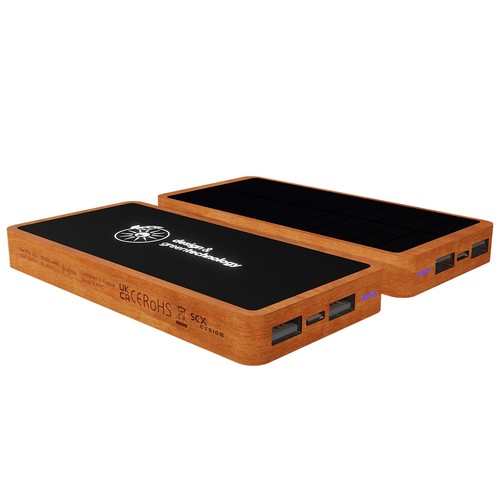Batterie solaire 10 000 mAh en bambou FSC® 100% et ABS soft- touch recyclé, personnalisable avec un logo lumineux. Le logo s'allume pendant 30 secondes lorsque la batterie est prise en main.