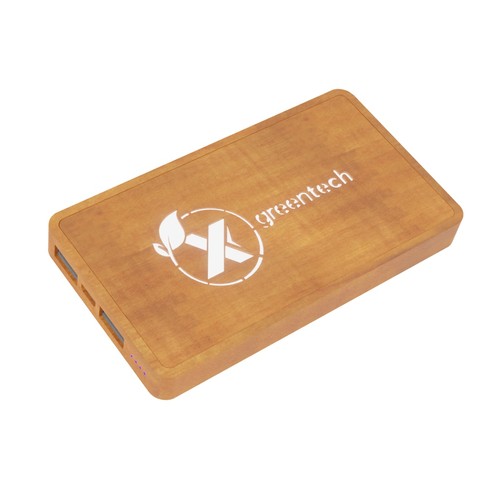 Batterie de secours lumineuse pensée dans le respect des normes environnementales : bois d'érable, câble 3- en-1 en rPET inclus. Le logo lumineux découpé au laser sur le bois permet d'éviter l'utilisation du plastique dans ce produit.