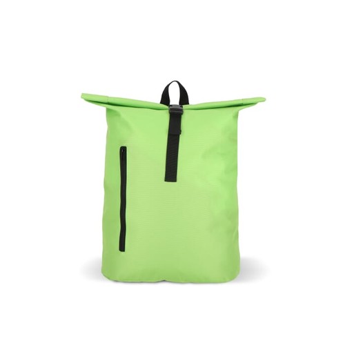 Ce sac à dos pratique au design roll- top très tendance est fabriqué en PET recyclé. Il est doté de bretelles réglables et rembourrées, d'une poignée supérieure et d'une poche frontale zippée, idéale pour les petits accessoires.