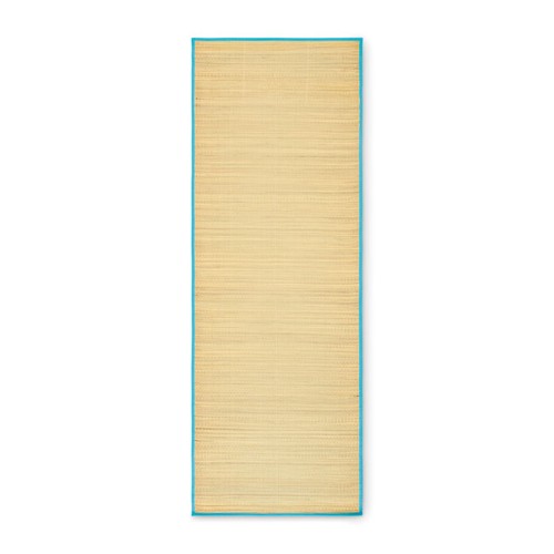 Natte de plage en paille naturelle enroulable avec sangle de transport en polyester.