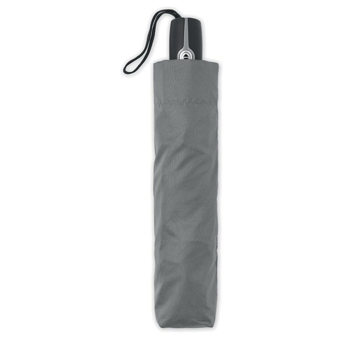 Parapluie tempête de 27 pouces, 3 plis, ouverture/fermeture automatique. Tissu en pongé 190T, mât en acier plaqué noir. Baleines en fibre de verre, revêtement intérieur noir en 1 partie. Poignée en PP noir avec bouton. Avec pochette assortie.