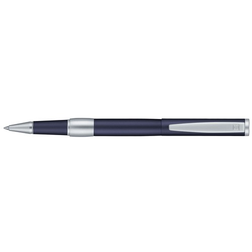 Roller avec corps en métal recouvert d'une laque souple mate bleu ou grise. Attributs en métal mat. Recharge roller métal sécurité 0,5 mm, écriture bleue.