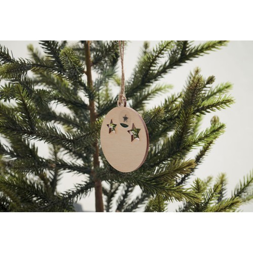 Suspension en bois en forme de boule en avec cordon de jute comprenant des graines d'épicéa. Présenté dans une enveloppe kraft.