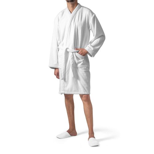 Peignoir de bain en coton (82%) et coton recyclé (18%) (350 g/m²).Touché doux, avec 1 ceinture de réglage et 2 poches (1 de chaque côté). Fabriqué en Europe. Tailles: S / M| 620 X 1150 mm