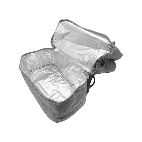 Sac à dos isotherme double compartiment en tissu wulong gris chiné RPET. Compatible avec tous nos modèles de bentos. Finition isolante de 3mm d'épaisseur recouverte d'une feuille d'aluminium. Fermeture éclair. Contenance : 15L.