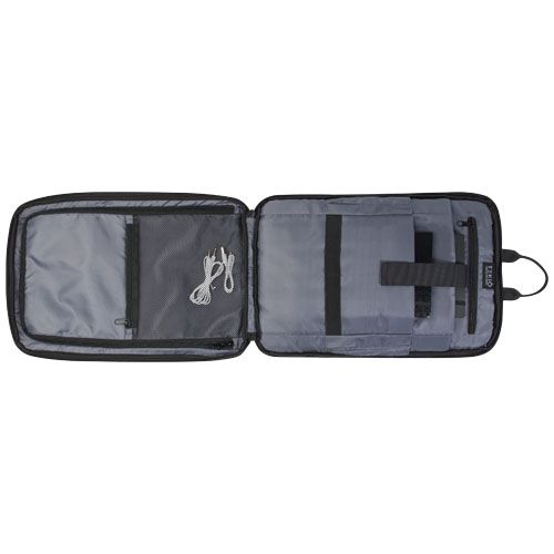Fabriqué en polyester recyclé 900D durable certifié GRS, le sac à dos Rise est doté de toutes les fonctions nécessaires. Il dispose d'une housse pour ordinateur portable rembourrée adaptée à un ordinateur portable de 15,6", d'une housse supplémentaire pour un petit ordinateur portable ou une tablette et de poches zippées pour les petits objets. De plus, il y a une sangle élastique à l'intérieur pour mettre une bouteille d'eau. L'arrière du sac à dos contient une sangle élastique pratique, ce qui le rend facile à attacher à un trolley.