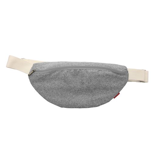 Sac ceinture en tissu wulong gris chiné RPET 130g/m². 2 espaces de rangement avec fermeture zippée dont l'un à l'arrière. Intérieurs entièrement doublés. Bandoulière réglable en coton sergé. Contenance : 1,5 L.