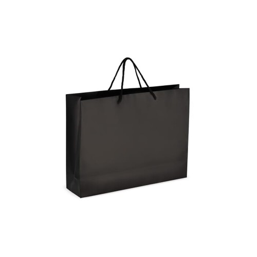 Sac cadeau élégant fabriqué à partir de papier, avec des poignées en corde de polyester recyclé de 5 mm d'épaisseur. Conçu pour transporter jusqu'à 5 kg, il présente un aspect luxueux avec des poignées noires et une finition intérieure noire. Parfait pour présenter des cadeaux.