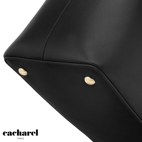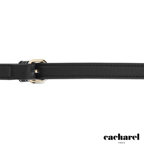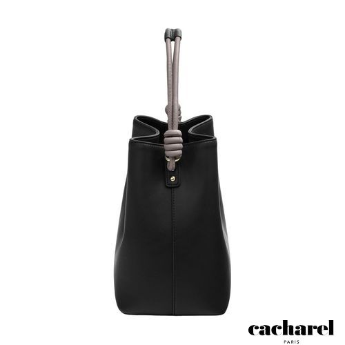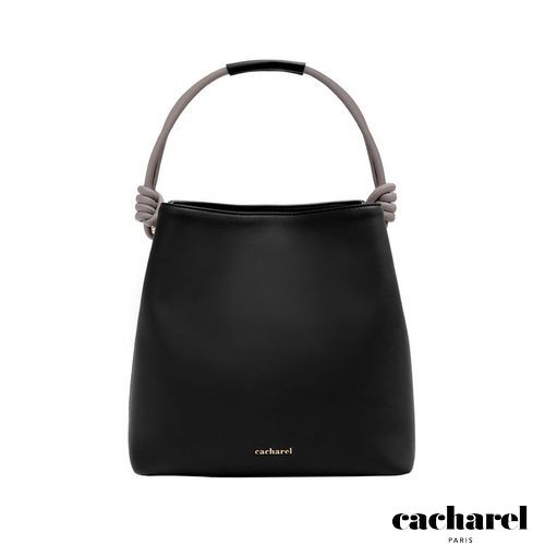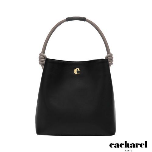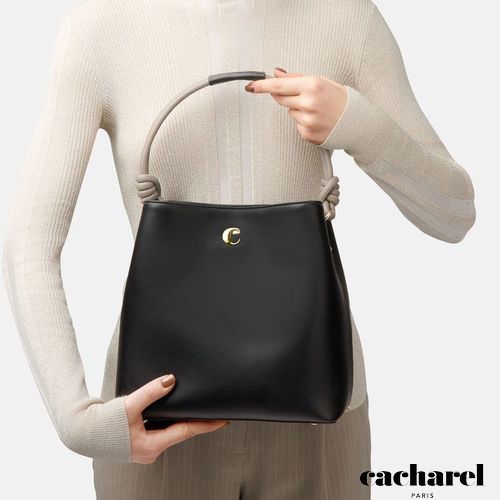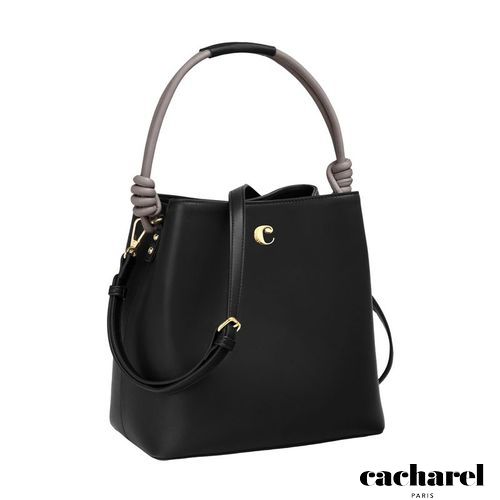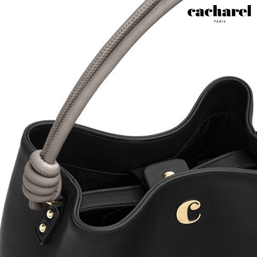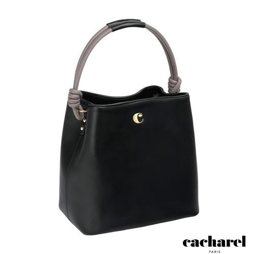 Le sac seau Apolline noir de Cacharel est fabriqué en cuir végétal (PU) souple, mat et de haute qualité et présente un design audacieux avec le logo "C" emblématique sur le devant. Le sac est rehaussé d'une poignée taupe en forme de nœud, qui ajoute une touche distinctive à la base noire élégante. Toutes les garnitures, y compris le logo "C" sur le devant, sont plaquées or clair pour une touche d'élégance. De plus, une signature Cacharel en TPU doré est apposée au dos. Le sac noir Apolline offre une solution à la fois fonctionnelle et élégante pour un usage quotidien, avec un intérieur spacieux et un design polyvalent. La ligne est douce, colorée et ludique, mêlant sans effort l'élégance et le charme moderne.