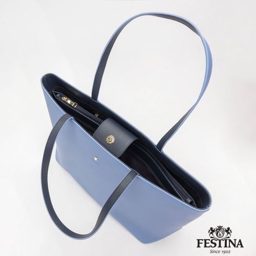 La célèbre ligne "Mademoiselle" de Festina est complétée cette saison par une nouvelle offre de sacs pour femmes. Ce grand sac fourre- tout est réalisé en cuir végétalien (PU) saffiano magnifiquement texturé. Chaque détail est délicatement travaillé, comme l'iconique plaque dorée signature F, présente dans toute la collection et soulignée d'un logo FESTINA magnifiquement embossé. Magnifiquement conçu, le produit présente des intérieurs colorés, contrastés et très pratiques, des intérieurs roamy. Ce sac spécifique a une fermeture à bouton magnétique, et un très grand compartiment intérieur zippé, parfait pour un ordinateur portable et autres objets de valeur. Il dispose également d'une autre poche plate et d'une poche plate zippée, parfaites pour organiser des documents et d'autres éléments essentiels. Cette version bleu clair a un intérieur contrasté de couleur marine, assorti au portefeuille éponyme.
