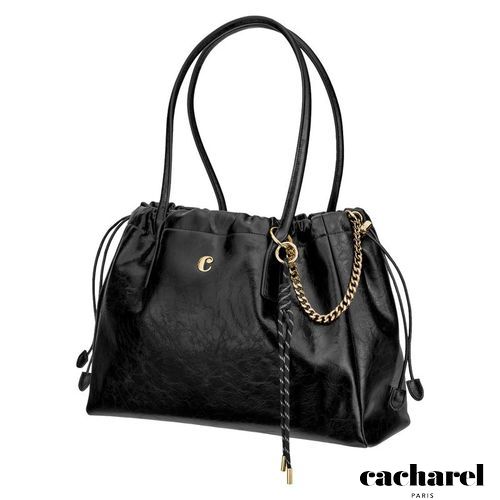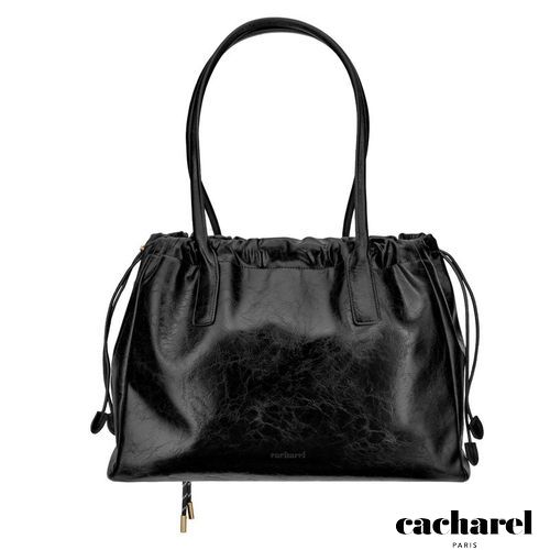 The Philomene tote bag embodies refined sophistication with a confident, fashion- forward edge. Made from a glazed, crinkled leather- like texture, it is signed with the signature Cacharel C plate, enhanced by elegant gold trims, and subtly embossed with the Cacharel logo. The material is soft, supple, and exudes a sense of luxury. Designed in a generous format, the tote offers a spacious and well- structured interior, ideal for everyday organization. It features a PU cord detail around the opening, giving it a modern pouch- like silhouette, and is adorned with a removable decorative cord- and- chain charm that adds a distinctive touch of style.It also features push closing that allow to thigten the closing. The perfect chic and feminine work bag, combining practicality and elegance in equal measure. Available in black