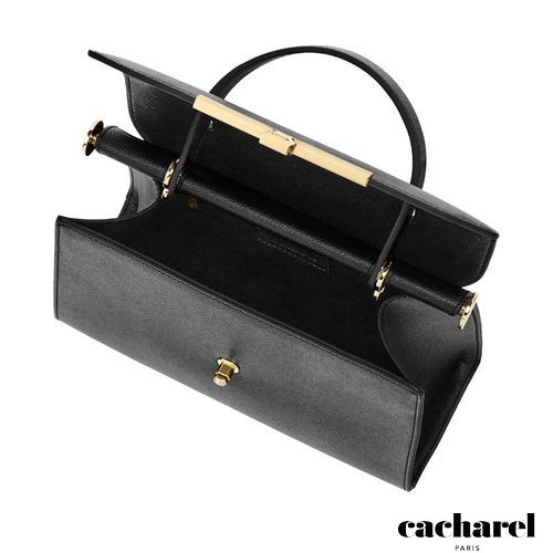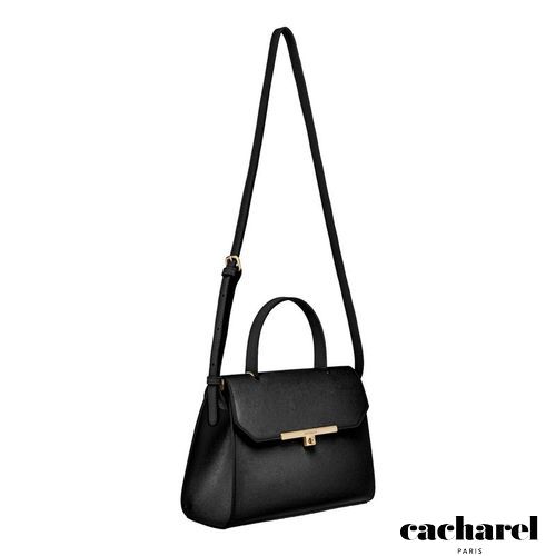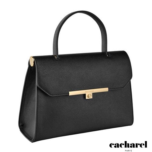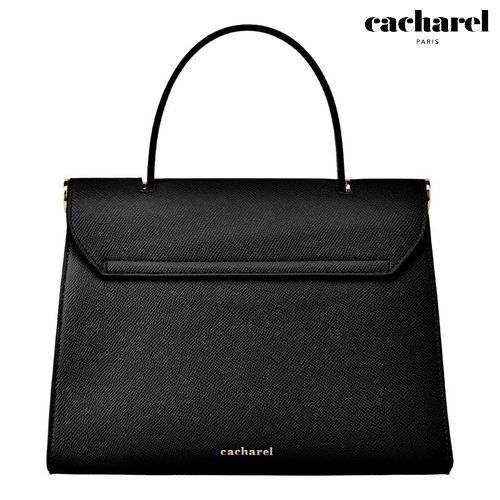 The Seraphine large bag exudes timeless sophistication with its structured and luxurious silhouette. Crafted from saffiano- textured vegan leather, it is signed with an exclusive gold turn- lock closure engraved with the Cacharel logo, embodying refined minimalism. Its elegant top handle enhances its polished character, while all gold trims add a feminine and elevated accent. A discreet gold TPU logo on the back completes the signature details. Designed to balance style and functionality, the spacious interior includes a zipped compartment for everyday organization. Available in taupe, light grey, and black.
