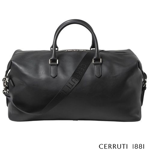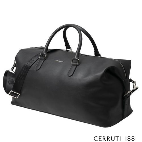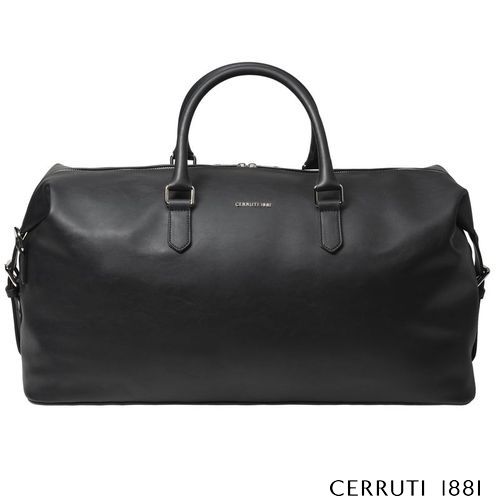 Le sac de week- end "Zoom", au design minimaliste et à l'allure contemporaine, est fait d'un matériau noir lisse et léger avec une signature en métal chromé brillant. Poids : 1.195 g - Dimensions : 560 x 270 x 280 mm. Livré dans son élégant sac coton sable Cerruti 1881.