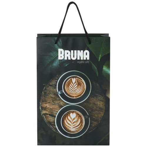 Grand sac en papier integra de 170 g/m22 mat artisanal (24 x 9 x 36 cm) avec poignées torsadées en plastique. L'avant et l'arrière personnalisables offrent suffisamment d'espace pour l'impression d'un logo, ou de tout autre design, ce qui en fait un excellent outil de marketing commercial. Fabriqué en Europe. 100% recyclable.