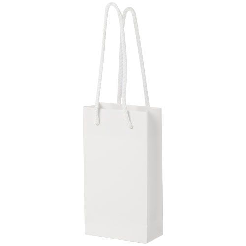 Petit sac en papier integra de 170 g/m2 mat artisanal (9,5 x 4 x 17 cm) avec poignées torsadées en plastique. L'avant et l'arrière personnalisables offrent suffisamment d'espace pour l'impression d'un logo, ou de tout autre design, ce qui en fait un excellent outil de marketing commercial. Fabriqué en Europe. 100% recyclable.