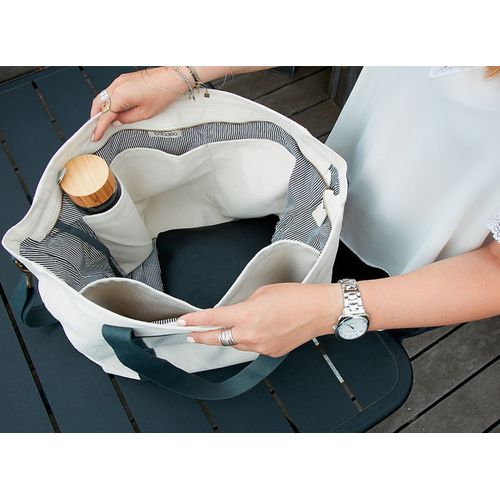 Grand sac week- end ultra- résistant et élégant en 100% coton toile de 454g/m². Fermeture zippée. Coutures superposées renforcées et liées. 3 poches intérieures et 1 poche extérieure. Pochette zippée intérieure amovible avec un mousqueton métallique. Doublure imprimée de 145g/m². Anses et bandoulière détachable en coton sergé. Astucieux espace au dos du sac spécialement conçu pour transporter un tapis de yoga, une veste ou autre sans utiliser l'espace intérieur. Contenance : 29 L.