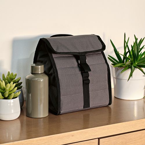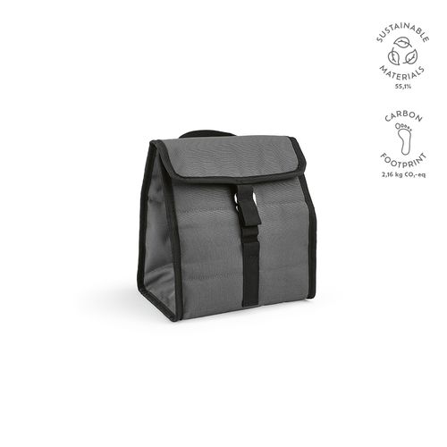 Sac isotherme Reykjavik 9L en rPET, avec poignées et finitions noires élégantes. Fabriqué à partir de tissu recyclé (rPET), il allie style et praticité. Son système de fermeture roll- top permet un accès facile au contenu, tandis que la poignée supérieure garantit un transport pratique. Fermeture par crochet métallique de type G, à la fois robuste, design et facile à manipuler. Capacité : 9 canettes.