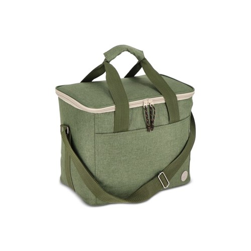 Sac isotherme spacieux, élégant et sportif en tissu rPET vert. Beaux détails en beige et noir. Pratique, il est doté d'une poignée et d'une bandoulière réglable.