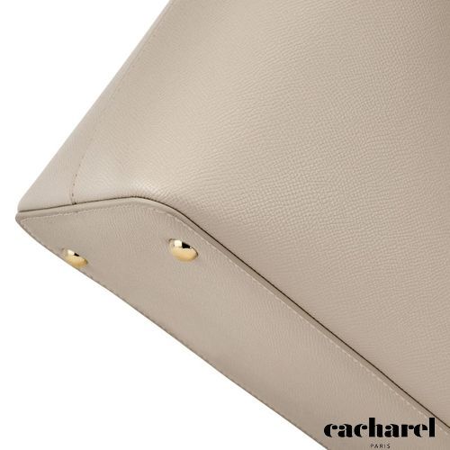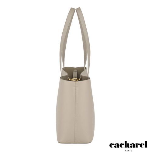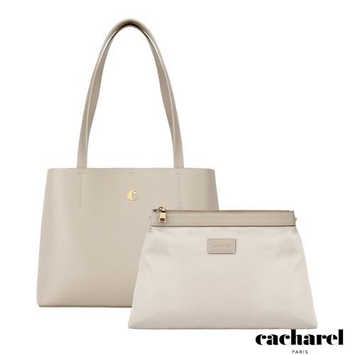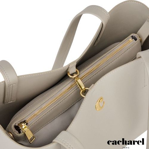 The Seraphine tote bag is a highly functional yet feminine piece, crafted from beautiful saffiano- textured vegan leather (PU) and offered in a playful palette of colors. It is signed with an oversized gold- toned C plate, adding a distinctive Cacharel touch. Designed as a 2- in-1 accessory, its spacious interior includes a large detachable pouch that can be used separately as a travel organizer. The tote closes with an elegant hook- and- ring system, bringing a subtle and unexpected twist to its design. Lightweight, easy to wear, and effortlessly versatile, it complements any outfit. Available in black, navy, taupe, yellow, and light grey.