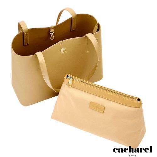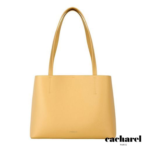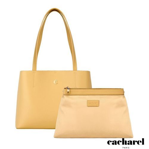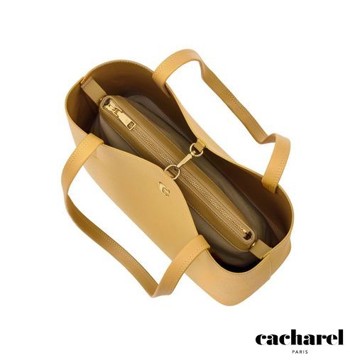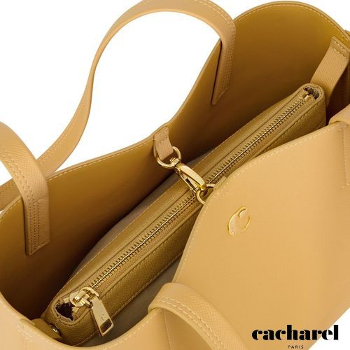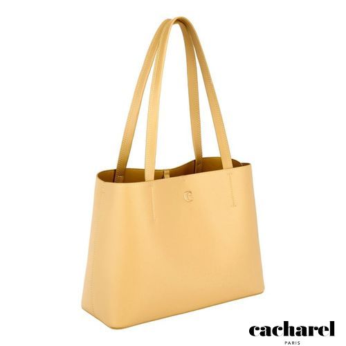 The Seraphine tote bag is a highly functional yet feminine piece, crafted from beautiful saffiano- textured vegan leather (PU) and offered in a playful palette of colors. It is signed with an oversized gold- toned C plate, adding a distinctive Cacharel touch. Designed as a 2- in-1 accessory, its spacious interior includes a large detachable pouch that can be used separately as a travel organizer. The tote closes with an elegant hook- and- ring system, bringing a subtle and unexpected twist to its design. Lightweight, easy to wear, and effortlessly versatile, it complements any outfit. Available in black, navy, taupe, yellow, and light grey.