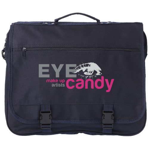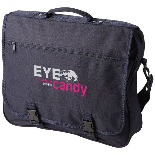 Sacoche conférence avec bandoulière ajustable, rabat à fermeture par boucle, poche zippée dans le rabat, compartiment principal zippé et plusieurs poches ouvertes sous le rabat.