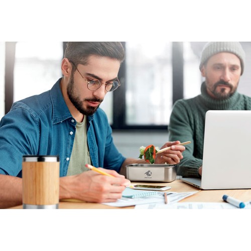 Lunchbox en acier inoxydable avec couvercle en bambou et 2 couverts. Bande élastique en polyester. Contenance 600 ml. Le bambou est un produit naturel, il peut y avoir des variations de couleur et de taille par article.