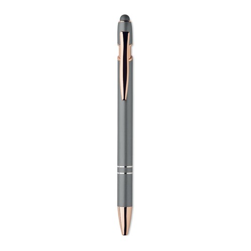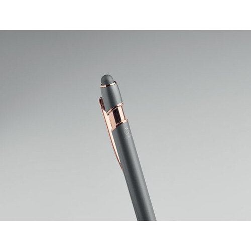 Stylo bille poussoir en aluminium recyclé avec détails façon or rose. Encre bleue.